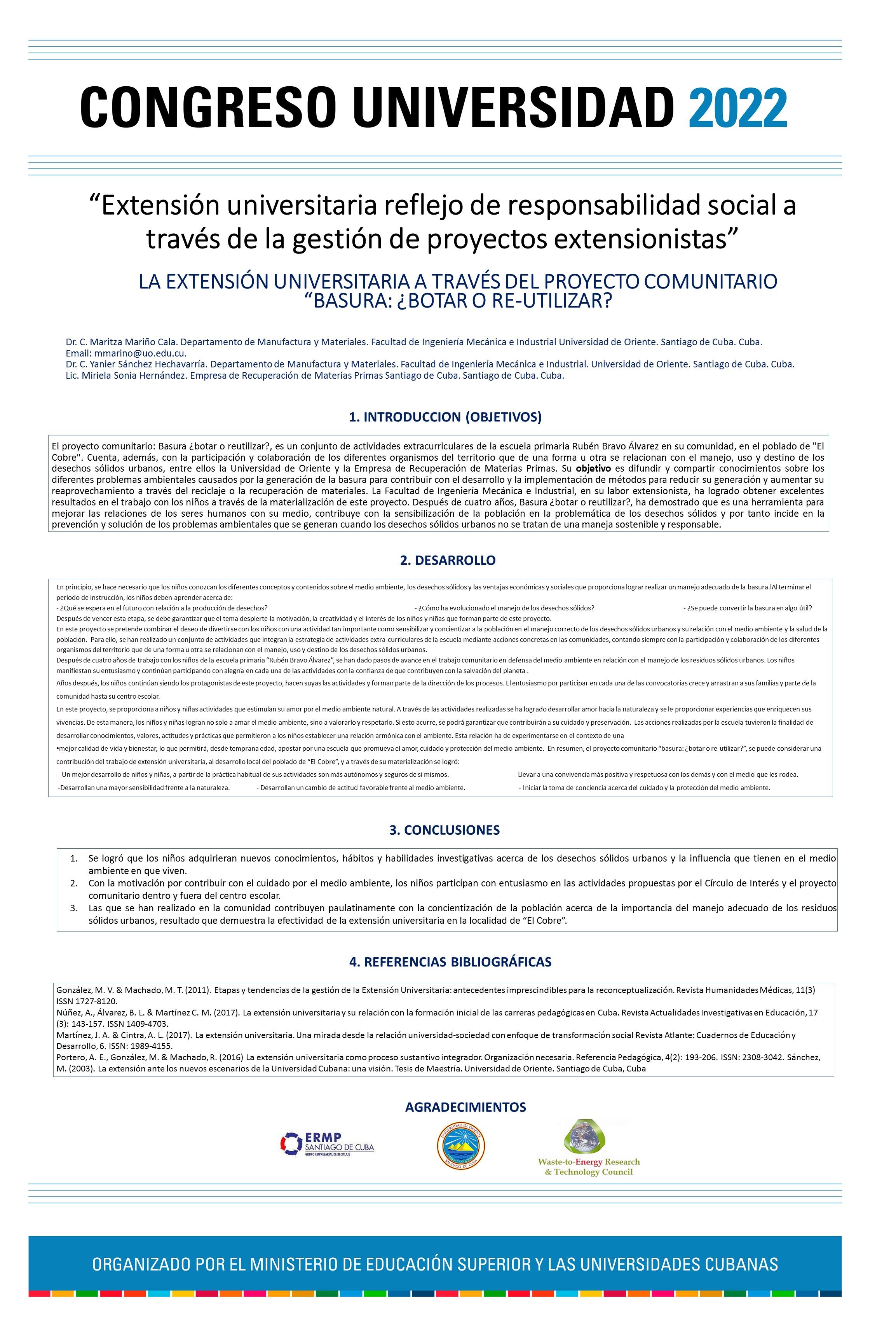 The community project: Garbage, throw away or reuse? is an integration of extracurricular activities at the Rubén Bravo Álvarez primary school in its community in the town of "El Cobre". It also has the participation and collaboration of the different organisms of the territory that in one way or another are related to the management, use and destination of urban solid waste, including the Universidad de Oriente and the Raw Materials Recovery Company. Its objective is to disseminate and share knowledge about the different environmental problems caused by the generation of wastes to contribute to the development and implementation of methods to reduce its generation and increase its reuse through recycling or recovery of materials. The Faculty of Mechanical and Industrial Engineering, in its extension work, has achieved excellent results in working with children through the materialization of this project. After four years, garbage, throw