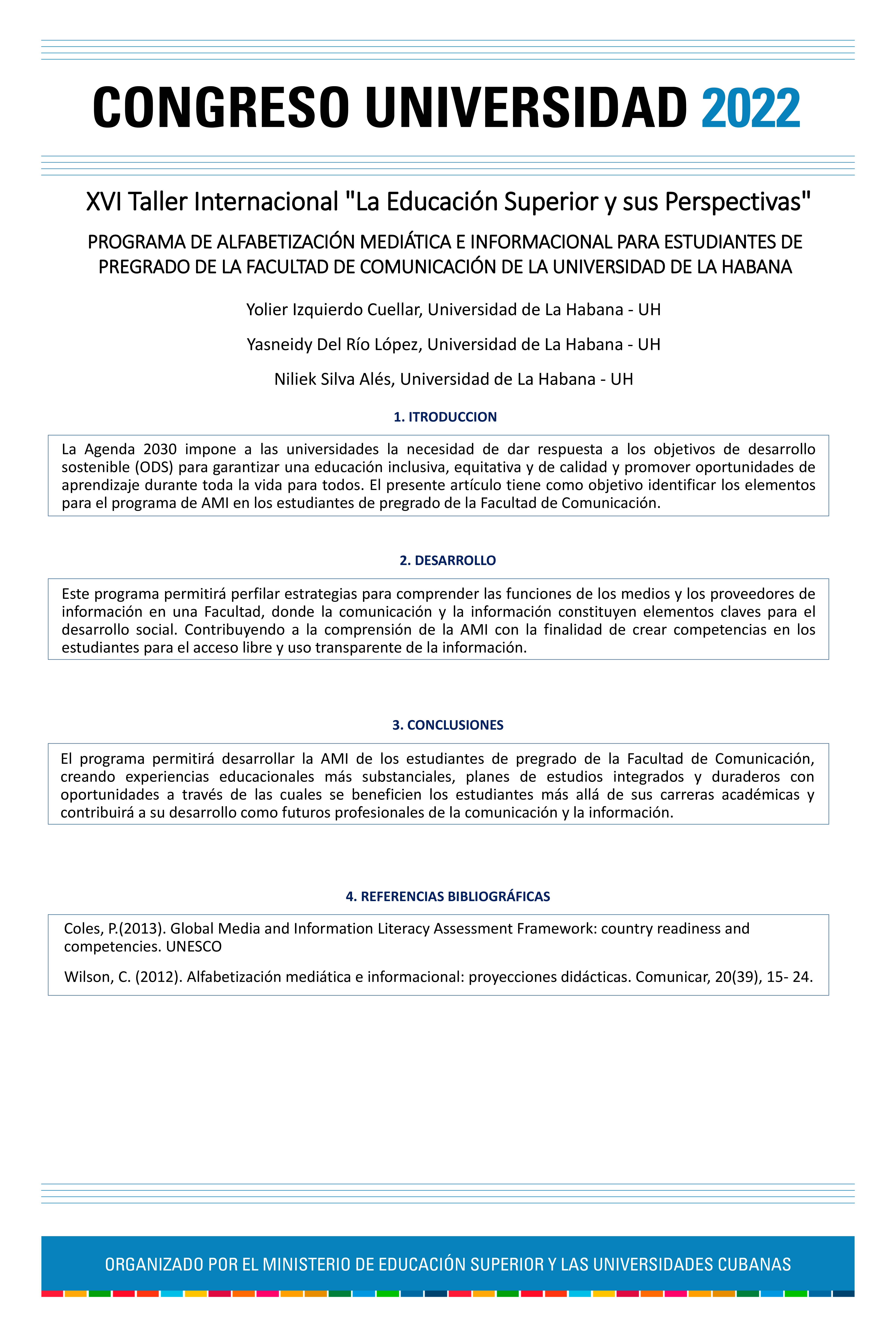La Alfabetización Mediática e Informacional (AMI) resulta un fenómeno de principio del siglo XXI, integra varios alfabetismos que combinan las competencias para acceder, evaluar y comunicar información y medios posibilitando el desarrollo de ciudadanos activos, el debate democrático, la participación social y el empoderamiento. La Agenda 2030 impone a las universidades la necesidad de dar respuesta a los objetivos de desarrollo sostenible (ODS) para garantizar una educación inclusiva, equitativa y de calidad y promover oportunidades de aprendizaje durante toda la vida para todos. El presente artículo tiene como objetivo identificar los elementos para el programa de Alfabetización Mediática Informacional en los estudiantes de pregrado de la Facultad de Comunicación de la Universidad de La Habana. Contribuyendo así afrontar los retos de los ODS de la Agenda 2030, teniendo en cuenta que es necesario el incremento en gran medida el nivel mínimo de alfabetización, para redoblar los esfuerzos para conseguir mayores avances en la consecución de los objetivos de la educación universal.